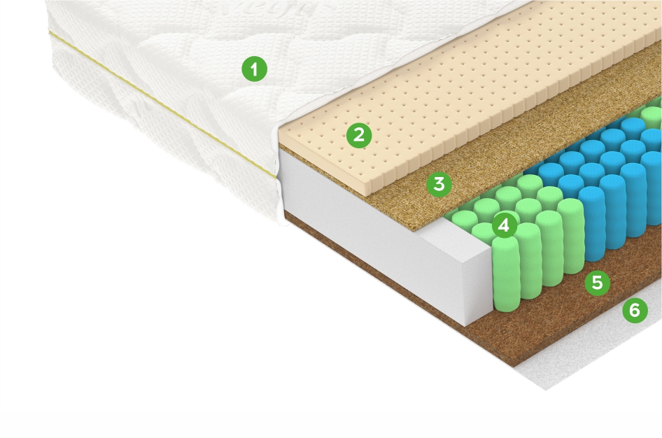 Кокосовая койра (x2)5Натуральный материал, состоящий из спрессованных волокон кокосового ореха. Слои из прочной и долговечной кокосовой койры используются для придания матрасу дополнительной жесткости.