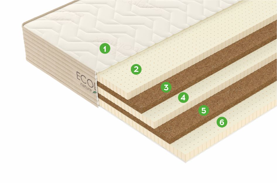 Кокосовая койра (x3)6Натуральный материал, состоящий из спрессованных волокон кокосового ореха. Слои из прочной и долговечной кокосовой койры используются для придания матрасу дополнительной жесткости.