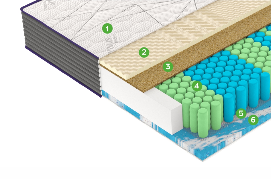 • сочетание дышащего природного латекса с микромассажным эффектом и пены с гранулами охлаждающего геля для дополнительного комфорта;