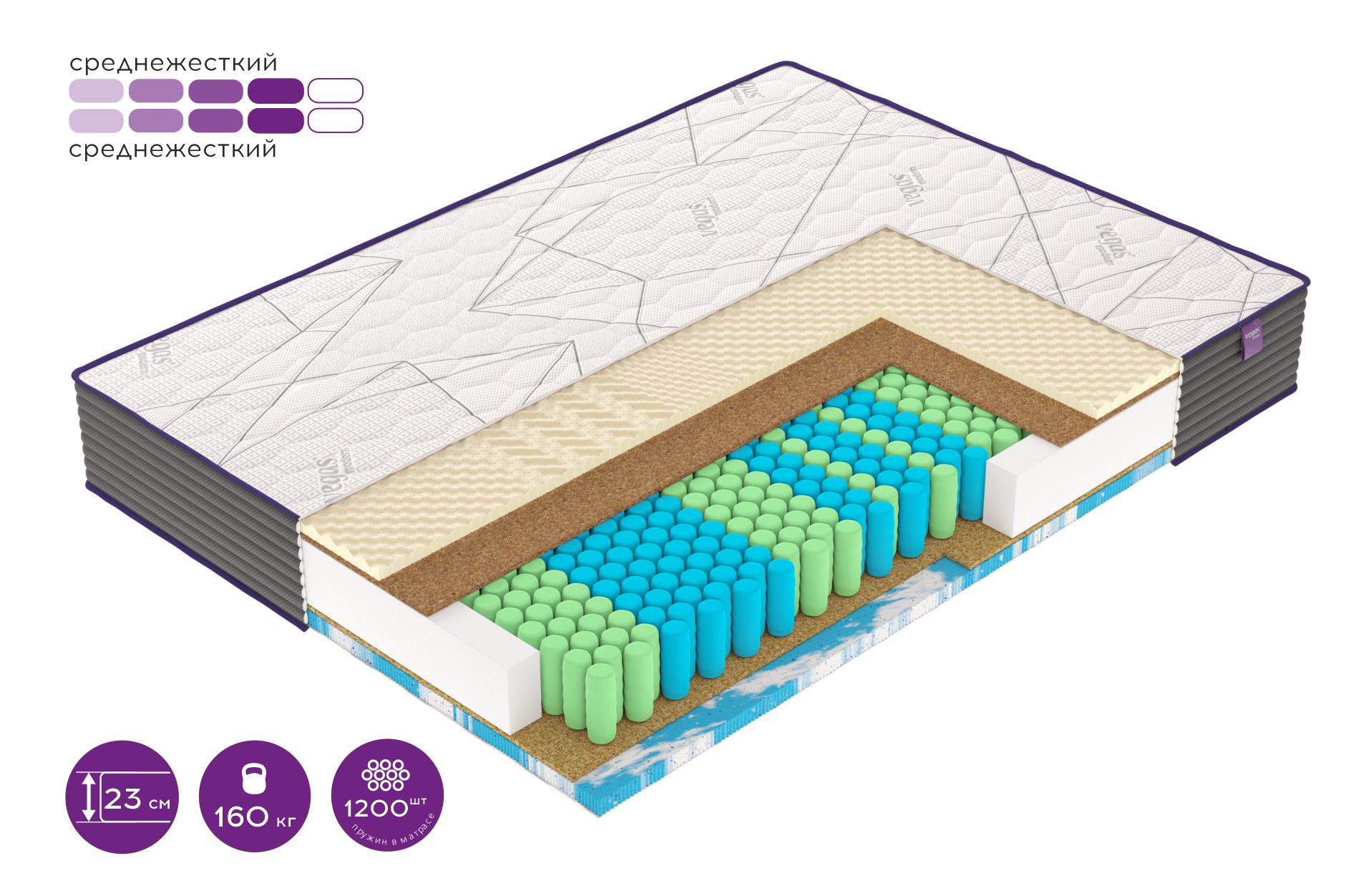 Матрас для тех, кто предъявляет повышенные требования к качеству и надежности спального места. Способен выдерживать максимальные нагрузки, оказывая расслабляющее микромассажное действие.